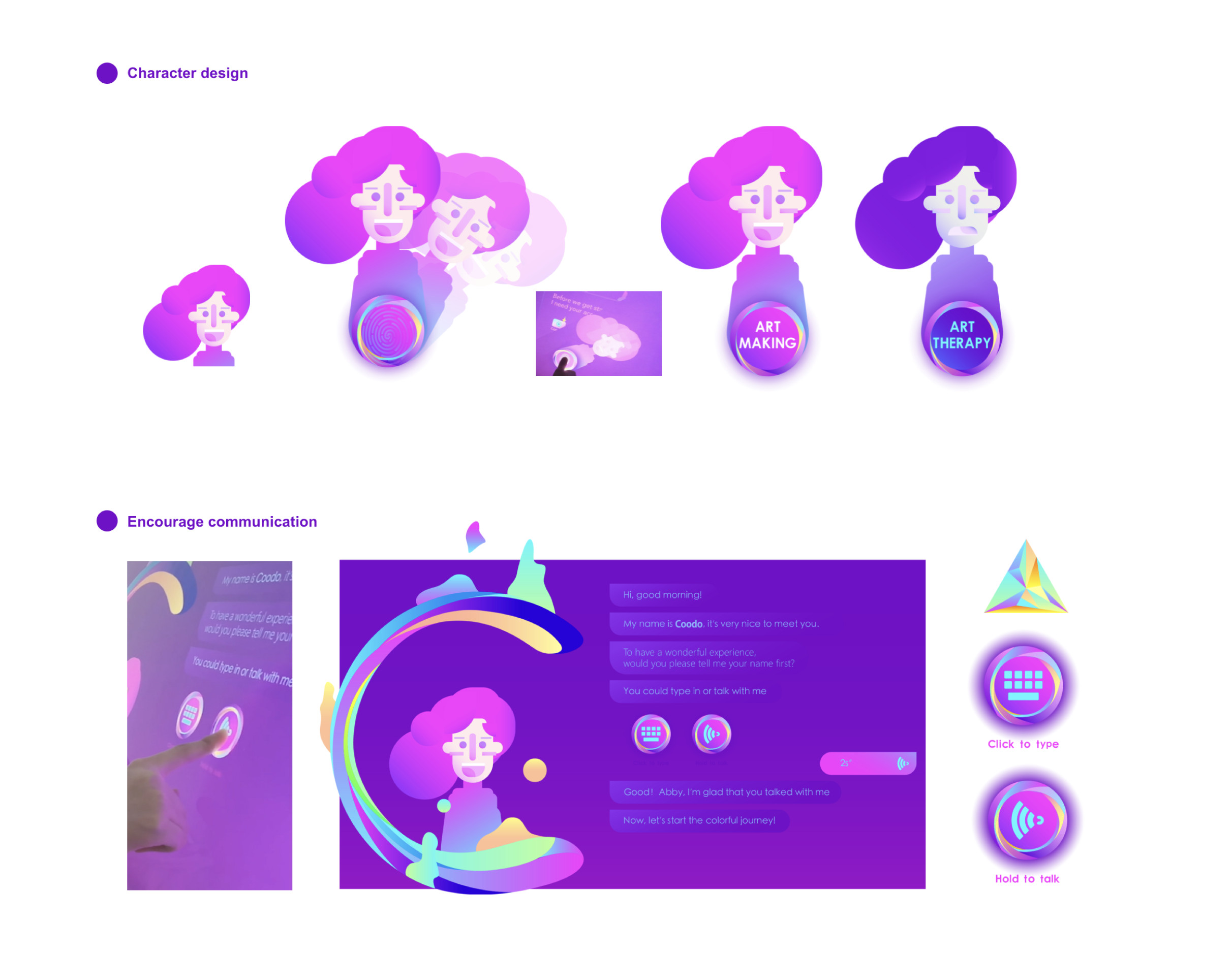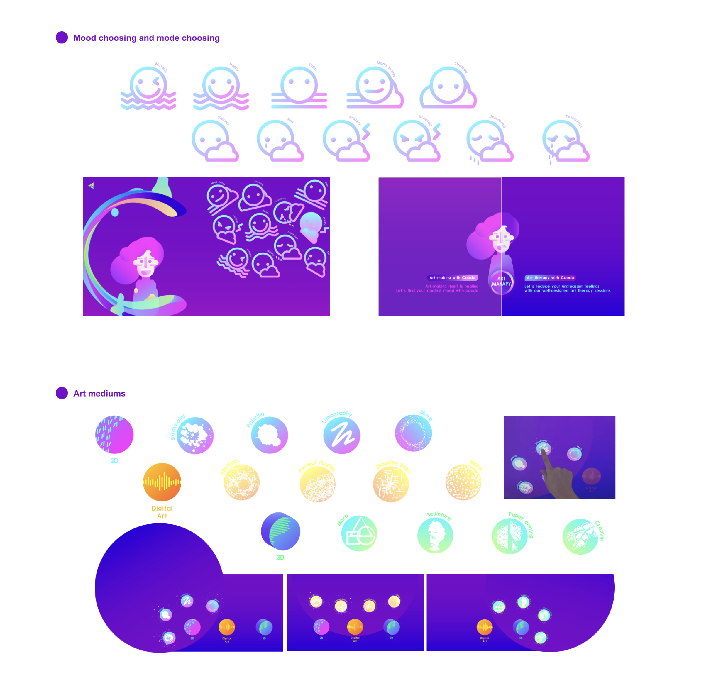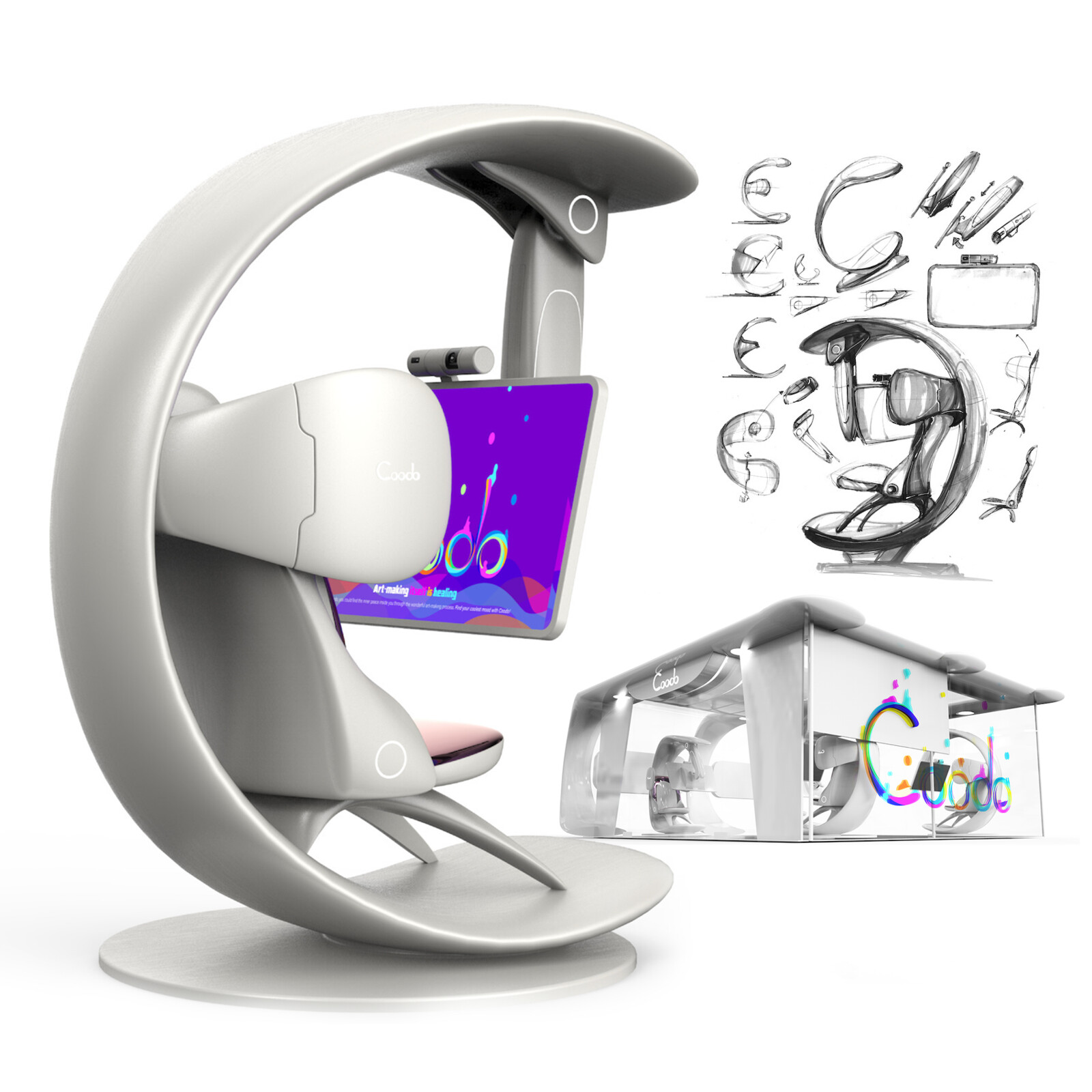 The project creatively proposes a new approach to art therapy based on the Internet platform and smart technologies. Through in-depth research, feasibility testing, technical analysis, interactive page design, etc., we finally created a Coodo machine dedicated to art therapy, which is designed for people who are experiencing certain pressure or facing mental health problems by providing a well-thought-out interactive process.